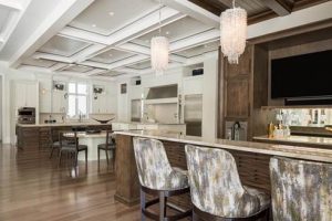 Complete with two oversized islands with sinks, abundant countertop space and a custom stone top breakfast table, the kitchen is ideal for entertaining. The cooktop wall is designed to be aesthetically pleasing yet practical. Chandeliers in antique silver leaf hang above the Old Biscayne Designs dining table, which seats twelve. Behind the formal dining area, the bar has wood-carved detailing that mirrors the family’s entertainment center. Highlighted by intricate ceiling designs and delicate trim work, expansive windows allow abundant natural light throughout.