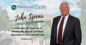 Fort Myers, Florida — The law firm of Henderson, Franklin, Starnes & Holt, P.A., is pleased to announce that Bonita Springs attorney John Spear has completed his recertification, marking his 25th year as a Florida Bar board certified specialist in real estate law. Board certification is Florida’s official, independent determination of a lawyer’s expertise to…